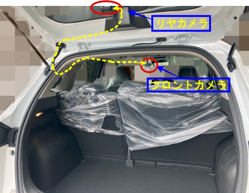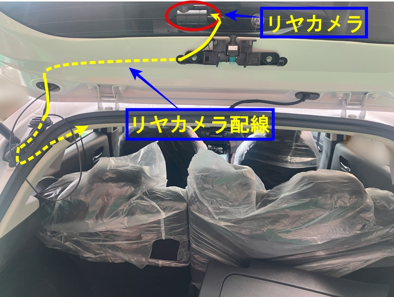 リヤカメラの配線は、蛇腹ゴムを通して車内に引き込みます。その後、ルーフライニング内を通してフロントカメラへ接続します。