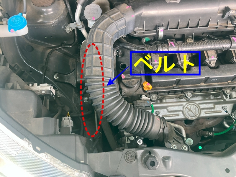 エンジンルーム内で音の発生源を探ると、ファンベルト付近から異音が確認できました。