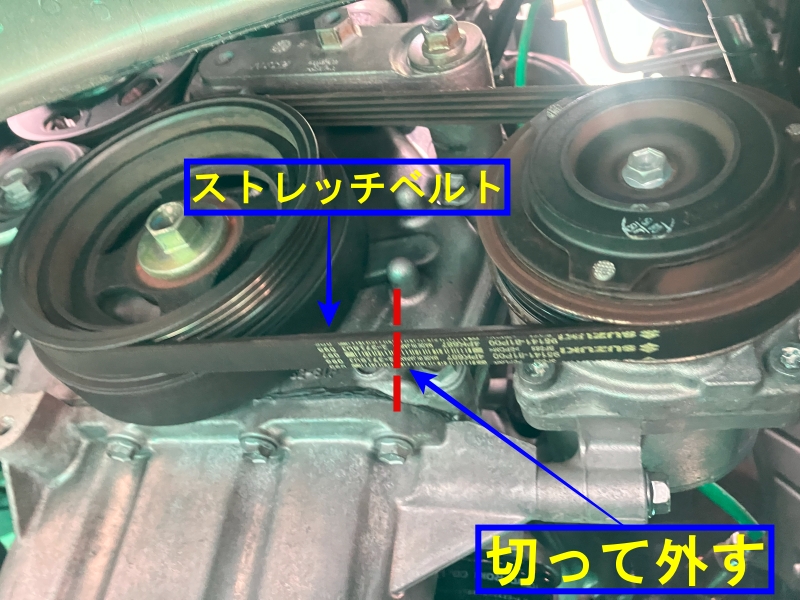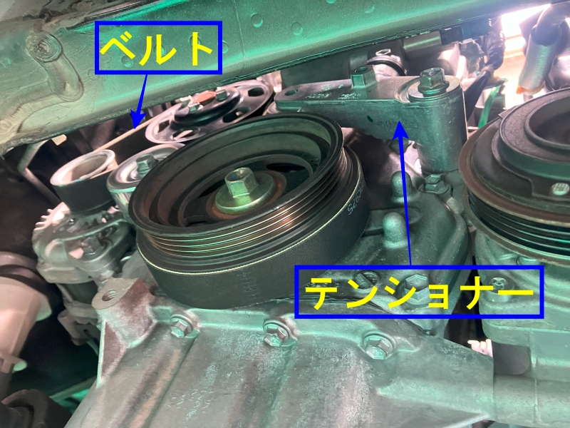 補機ベルトは2本あり、1本はオートテンショナーで張られており、もう1本(エアコン用)はストレッチベルトを使用しています。