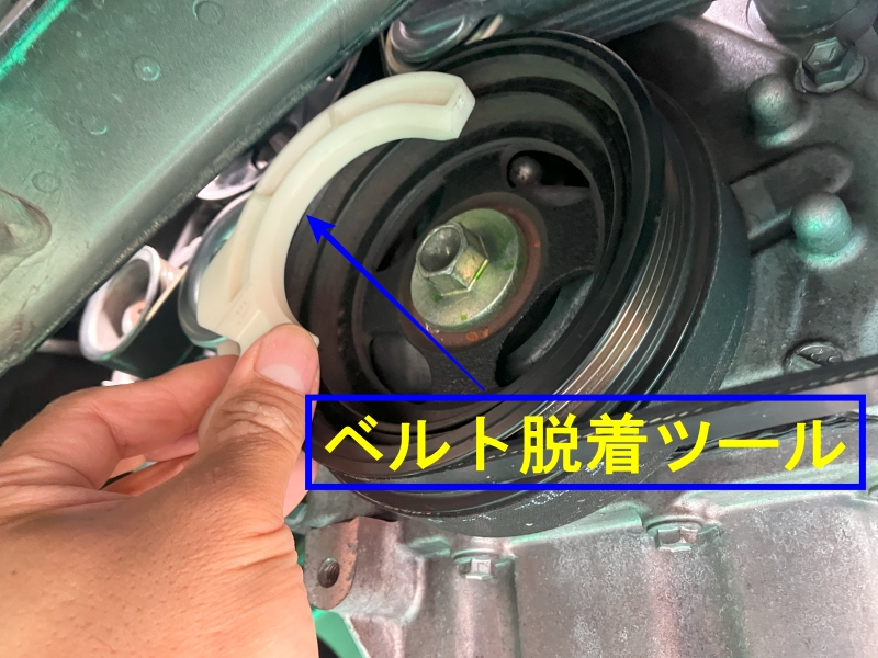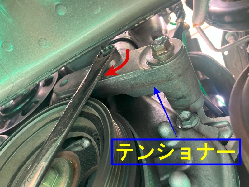 ファンベルトのオートテンショナーは17mmのレンチを使用し、時計回りに力を加えて縮めます。その状態でベルトを取り外します。